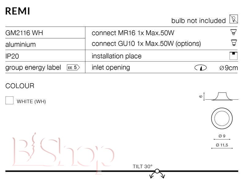 Кількість ламп: 1. Тип цоколя: GU10. Потужність лампи (Вт): 50. Діаметр (див): 11.5. Глибина урізання (див): 6. Розмір урізного отвору (див): 9.