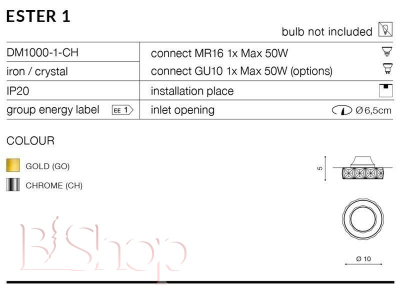 Кількість ламп: 1. Тип цоколя: GU10. Висота (див): 5. Потужність лампи (Вт): 50. Діаметр (див): 10. Розмір урізного отвору (див): 6.5.