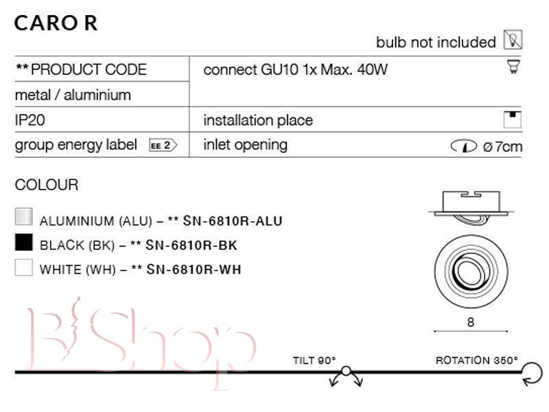 Кількість ламп: 1. Тип цоколя: GU10. Висота (див): 2.3. Потужність лампи (Вт): 40. Діаметр (див): 9.5. Розмір урізного отвору (див): 8.5.