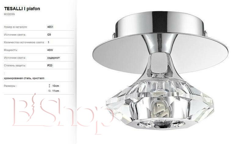 Кількість ламп: 1. Тип цоколя: G9. Висота (див): 10. Потужність лампи (Вт): 40. Діаметр (див): 11.
