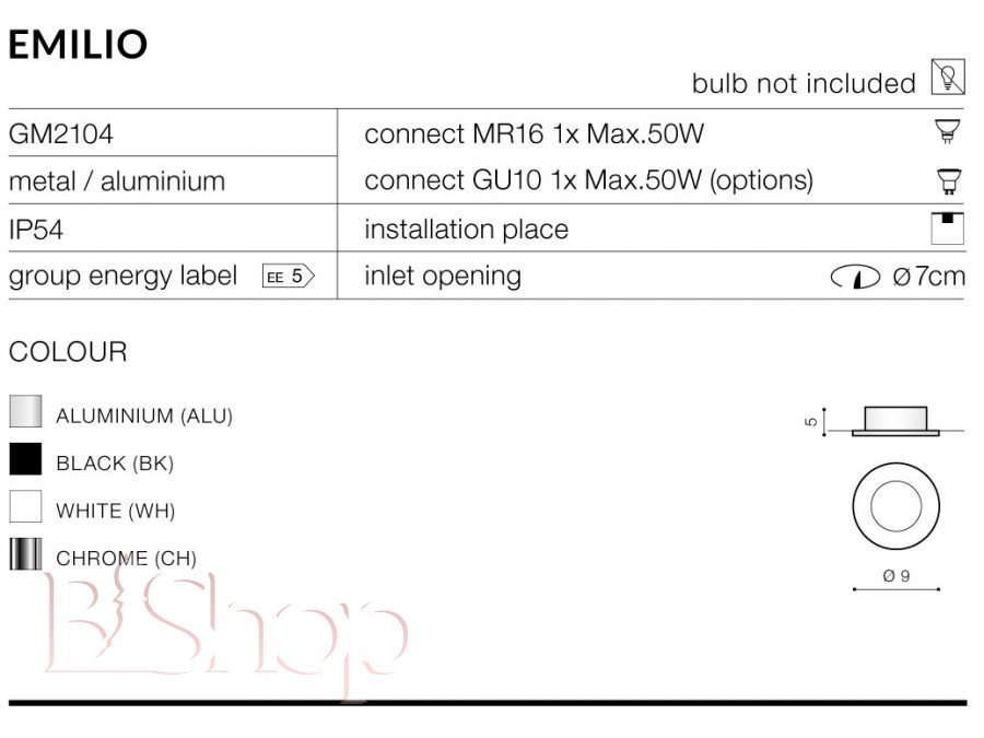 Кількість ламп: 1. Тип цоколя: GU10. Потужність лампи (Вт): 50. Діаметр (див): 9. Глибина урізання (див): 5. Розмір урізного отвору (див): 7.
