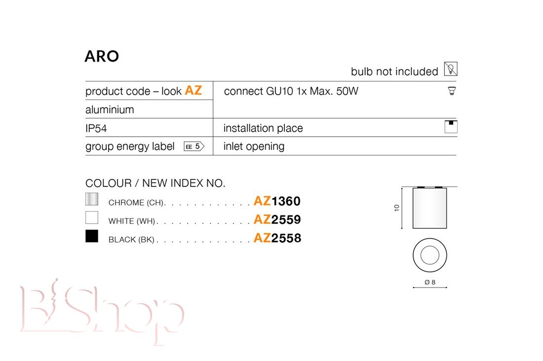 Кількість ламп: 1. Тип цоколя: GU10. Висота (див): 10. Потужність лампи (Вт): 40. Діаметр (див): 8.