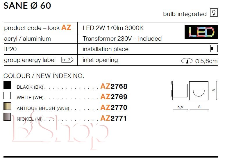 Кількість ламп: 1. Тип цоколя: LED. Ширина (див): 8. Потужність лампи (Вт): 2. Довжина (див): 8. Глибина урізання (див): 5.5. Розмір урізного отвору (див): 5.6.