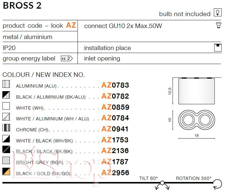 Кількість ламп: 2. Тип цоколя: GU10. Висота (див): 12. Ширина (див): 10. Потужність лампи (Вт): 50. Довжина (див): 17.