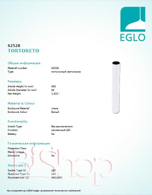 Кількість ламп: 1. Тип цоколя: LED. Висота (см): 60. Потужність лампи (Вт): 9. Діаметр (див): 6.