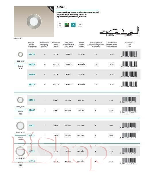 Кількість ламп: 1. Тип цоколя: LED. Потужність лампи (Вт): 2.7. Діаметр (див): 8.5. Глибина урізання (див): 2.5. Розмір урізного отвору (см): 7.4.