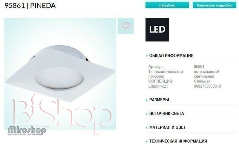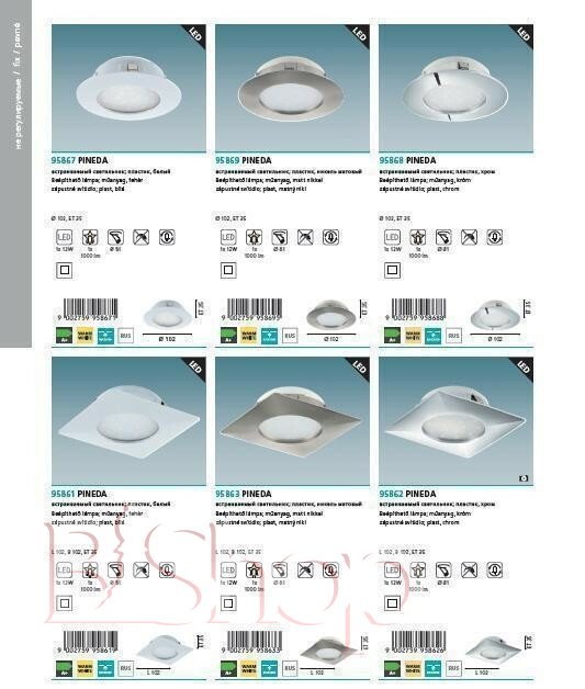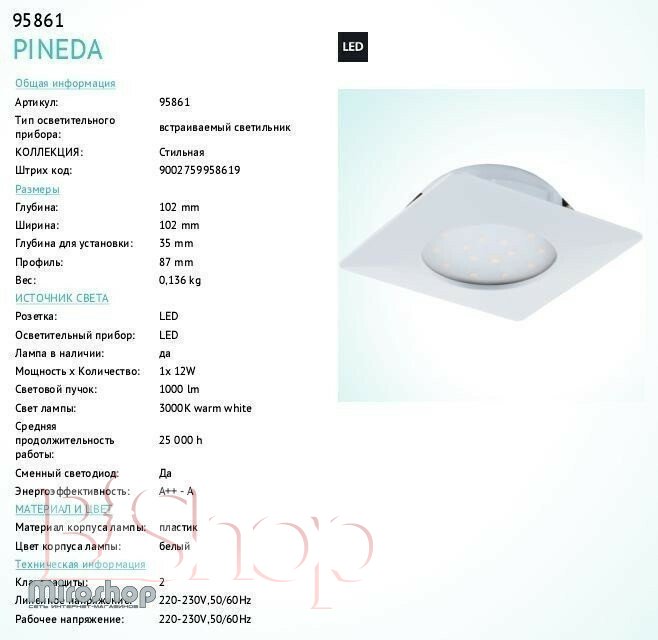 Кількість ламп: 1. Тип цоколя: LED. Ширина (див): 10.2. Потужність лампи (Вт): 6. Довжина (див): 10.2. Глибина урізання (див): 3.5. Розмір урізного отвору (див): 8.7.