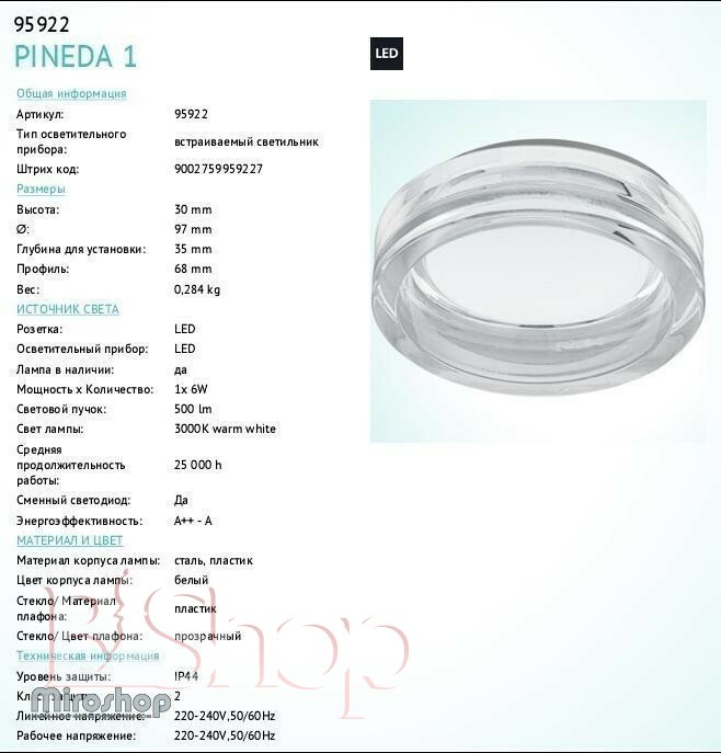 Кількість ламп: 1. Тип цоколя: LED. Висота (див): 3. Потужність лампи (Вт): 6. Діаметр (див): 9.7. Глибина урізання (див): 3.5. Розмір урізного отвору (см): 6.8.