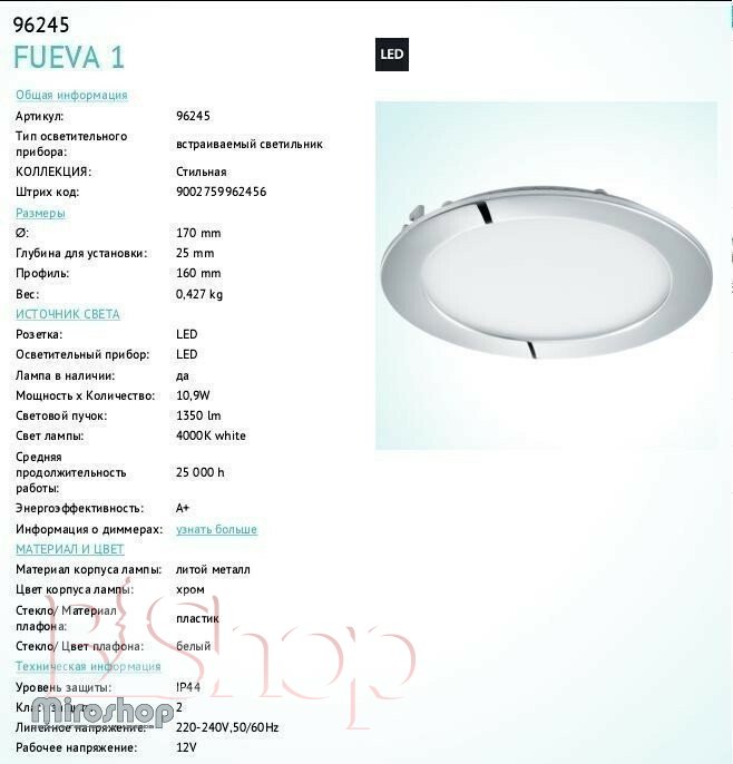 Кількість ламп: 1. Тип цоколя: LED. Потужність лампи (Вт): 10.9. Діаметр (див): 17. Глибина урізання (див): 2.5. Розмір урізного отвору (див): 16.
