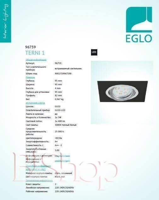 Кількість ламп: 1. Тип цоколя: GU10. Ширина (див): 9.5. Потужність лампи (Вт): 5. Довжина (див): 9.5. Розмір урізного отвору (див): 8.2.