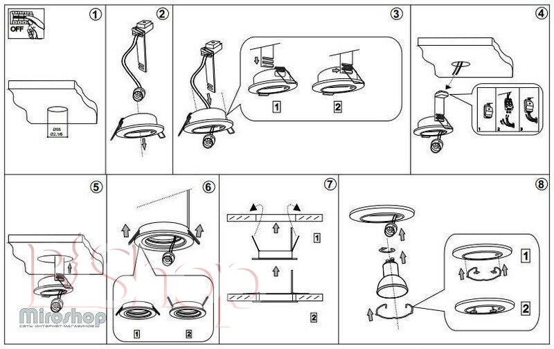 Кількість ламп: 1. Тип цоколя: GU10. Висота (див): 2. Потужність лампи (Вт): 50. Діаметр (см): 9.5. Розмір урізного отвору (див): 5.5.