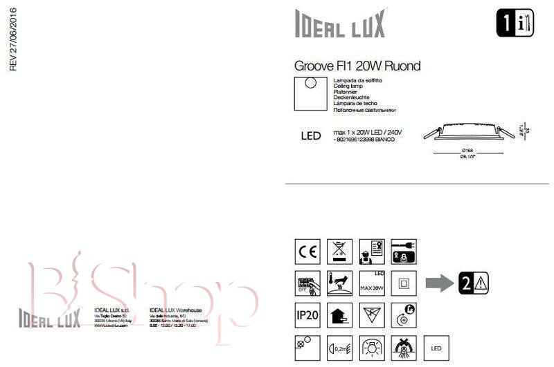 Кількість ламп: 1. Тип цоколя: LED. Висота (див): 3.5. Потужність лампи (Вт): 20. Діаметр (див): 16.8.