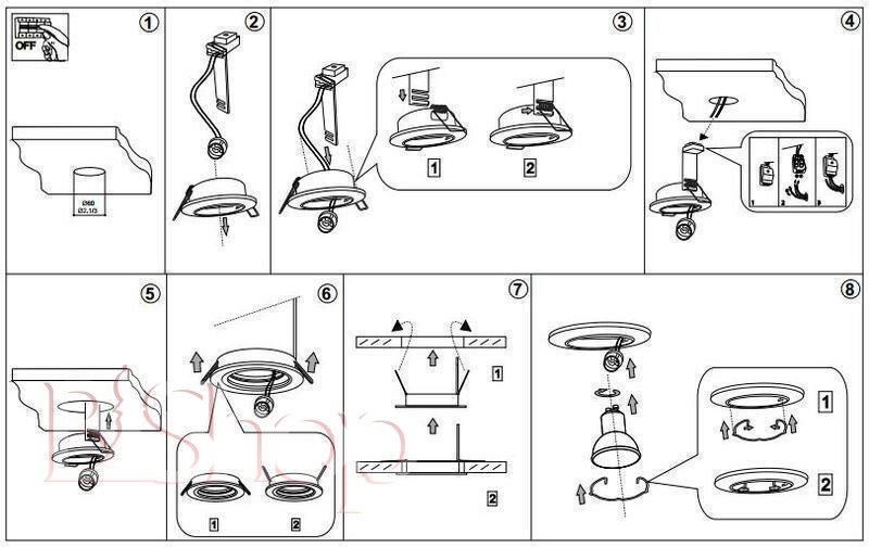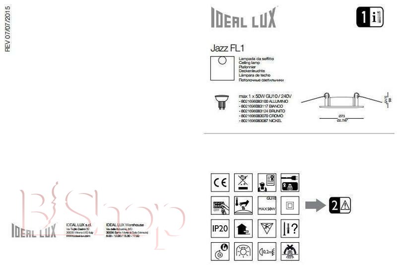 Кількість ламп: 1. Тип цоколя: GU10. Висота (див): 8.5. Потужність лампи (Вт): 50. Діаметр (див): 7.3.