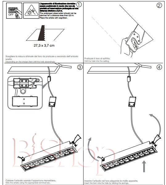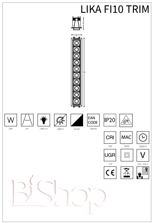Кількість ламп: 10. Тип цоколя: LED. Ширина (див): 4.5. Потужність лампи (Вт): 2. Довжина (див): 27.8. Глибина урізання (див): 4.8. Розмір урізного отвору (див): 3.7х27.3.