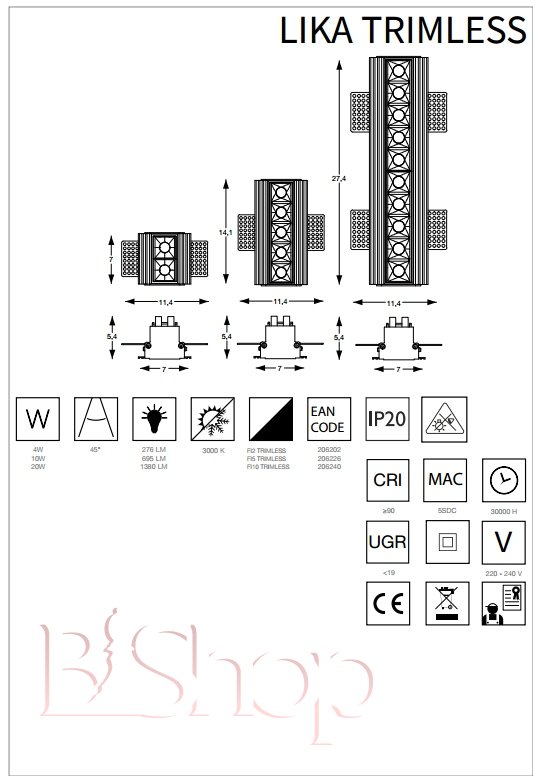 Кількість ламп: 10. Тип цоколя: LED. Ширина (див): 7.1. Потужність лампи (Вт): 2. Довжина (див): 27.4. Глибина урізання (див): 5.4. Розмір урізного отвору (див): 7х27.8.