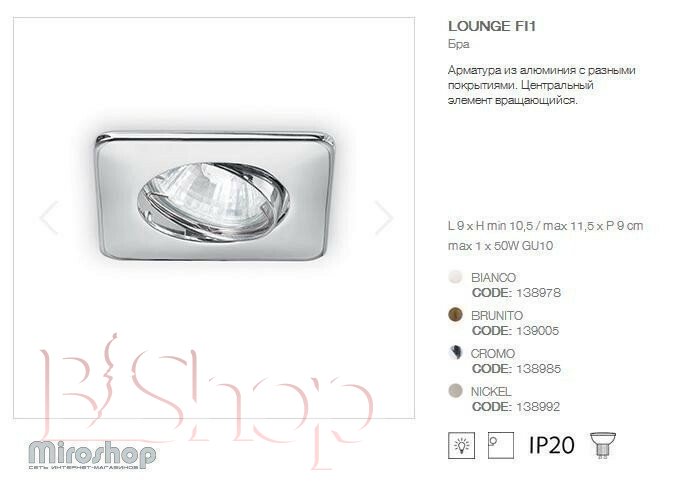 Кількість ламп: 1. Тип цоколя: GU10. Ширина (див): 9. Потужність лампи (Вт): 50. Довжина (див): 9. Глибина урізання (див): 9.5. Розмір урізного отвору (див): 6.7.