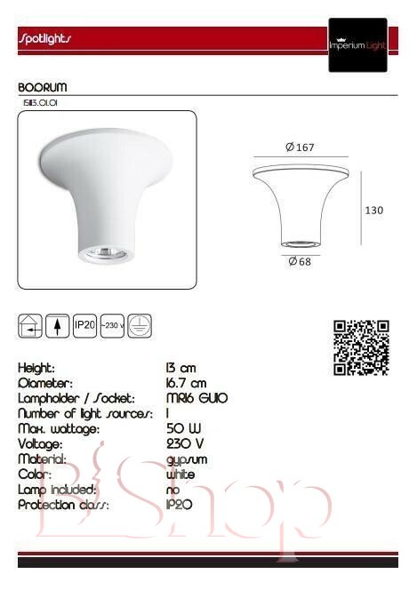 Кількість ламп: 1. Тип цоколя: GU10. Висота (див): 13. Потужність лампи (Вт): 50. Діаметр (див): 16.7.