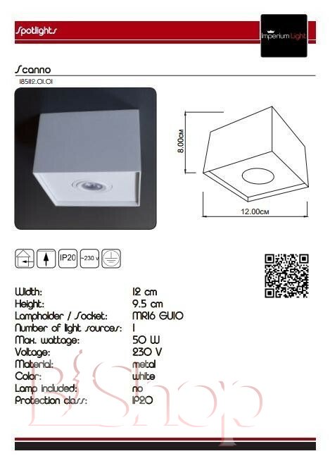 Кількість ламп: 1. Тип цоколя: GU10. Висота (див): 8. Ширина (див): 12. Потужність лампи (Вт): 50.