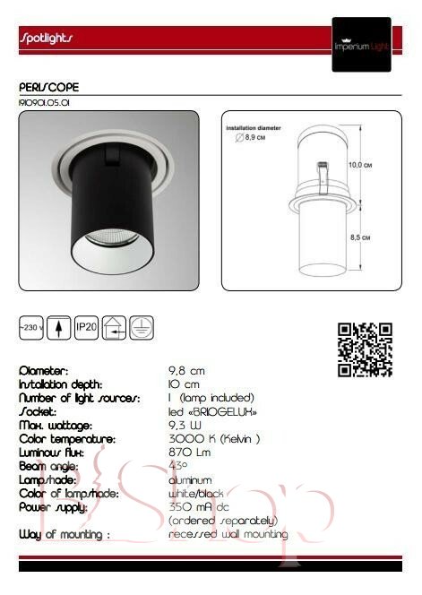 Кількість ламп: 1. Тип цоколя: LED. Висота (див): 8.5. Потужність лампи (Вт): 9.3. Діаметр (див): 9.8. Глибина урізання (див): 10. Розмір урізного отвору (див): 8.9.