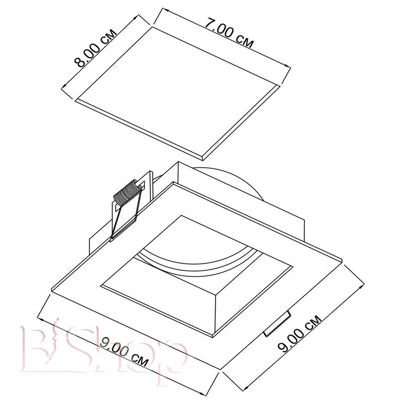 Кількість ламп: 1. Тип цоколя: GU10. Ширина (див): 9. Потужність лампи (Вт): 50. Довжина (див): 9. Глибина урізання (див): 5. Розмір урізного отвору (див): 7х8.