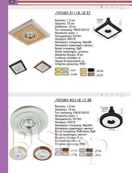 Кількість ламп: 1. Тип цоколя: GU10. Висота (див): 1.3. Потужність лампи (Вт): 50. Діаметр (див): 12. Глибина урізання (див): 6. Розмір урізного отвору (див): 8.