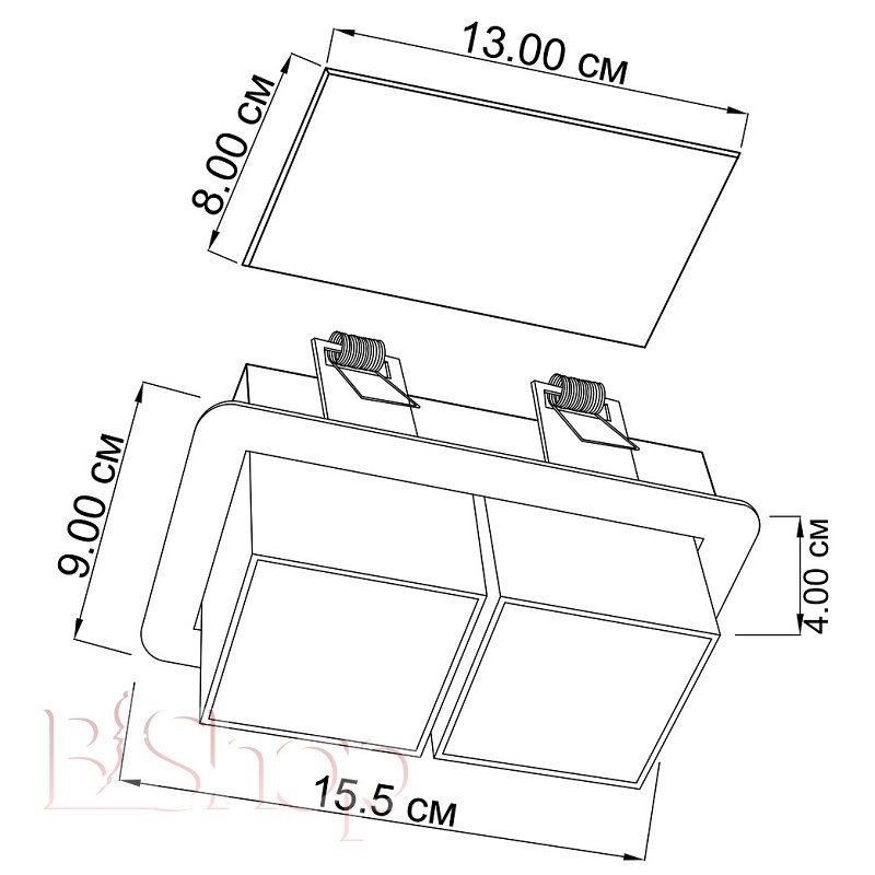 Кількість ламп: 2. Тип цоколя: GU10. Висота (див): 4. Ширина (див): 9. Потужність лампи (Вт): 50. Довжина (див): 15.5. Розмір урізного отвору (див): 8х13.