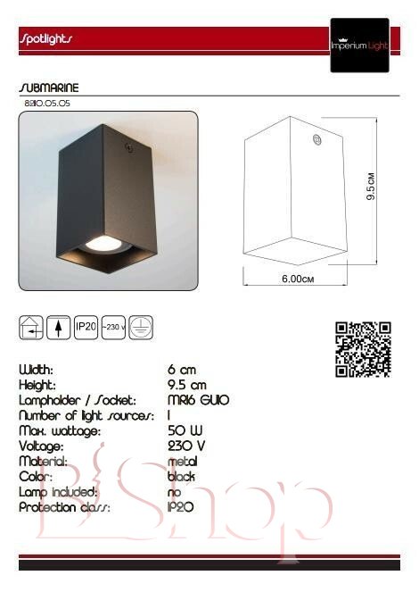 Кількість ламп: 1. Тип цоколя: GU10. Висота (див): 9.5. Ширина (див): 6. Потужність лампи (Вт): 50.