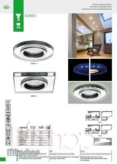 Кількість ламп: 1. Тип цоколя: GU10. Висота (див): 2.4. Потужність лампи (Вт): 20. Діаметр (див): 9. Розмір урізного отвору (див): 7.