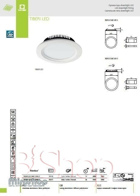 Кількість ламп: 1. Тип цоколя: LED. Потужність лампи (Вт): 24. Діаметр (див): 19.5. Розмір урізного отвору (див): 17.5.