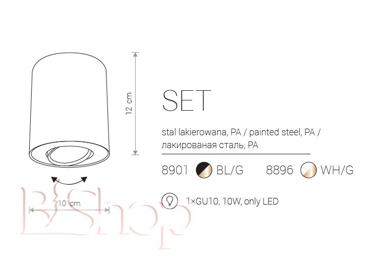 Кількість ламп: 1. Тип цоколя: GU10. Висота (див): 12. Потужність лампи (Вт): 10. Діаметр (див): 10.