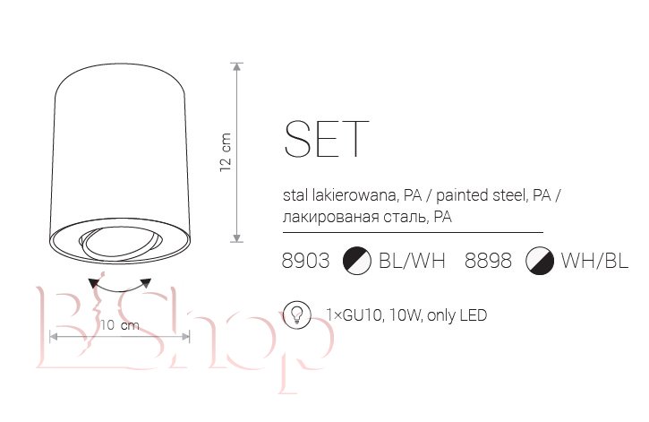 Кількість ламп: 1. Тип цоколя: GU10. Висота (див): 12. Потужність лампи (Вт): 10. Діаметр (див): 10.