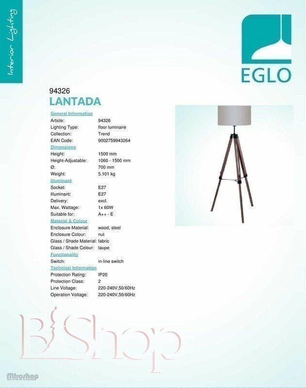 Кількість ламп: 1. Тип цоколя: E27. Висота (див): 150. Потужність лампи (Вт): 60. Діаметр (див): 70.