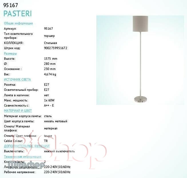 Кількість ламп: 1. Тип цоколя: E27. Висота (див): 157.5. Потужність лампи (Вт): 60. Діаметр (див): 28.
