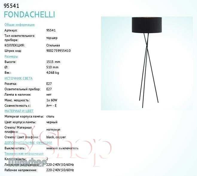 Кількість ламп: 1. Тип цоколя: E27. Висота (див): 151.5. Потужність лампи (Вт): 60. Діаметр (див): 51.