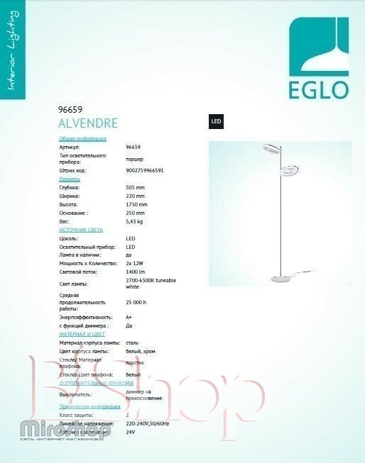 Кількість ламп: 2. Тип цоколя: LED. Висота (див): 175. Ширина (див): 22. Глибина (див): 50.5. Потужність лампи (Вт): 12.