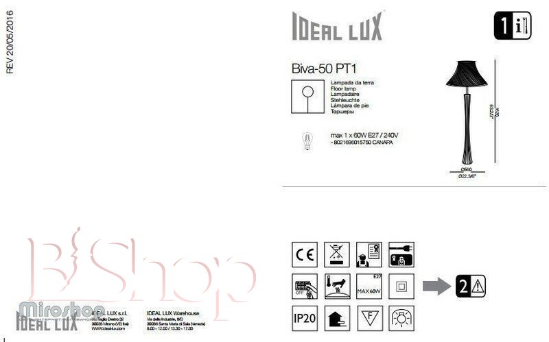 Кількість ламп: 1. Тип цоколя: E27. Висота (див): 162. Потужність лампи (Вт): 60. Діаметр (див): 56.