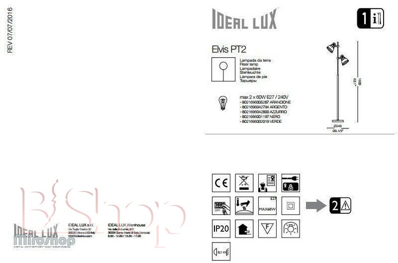 Кількість ламп: 2. Тип цоколя: E27. Висота (див): 160. Потужність лампи (Вт): 60. Діаметр (див): 24.