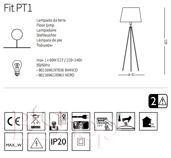 Кількість ламп: 1. Тип цоколя: E27. Висота (див): 155. Ширина (див): 42. Потужність лампи (Вт): 60.