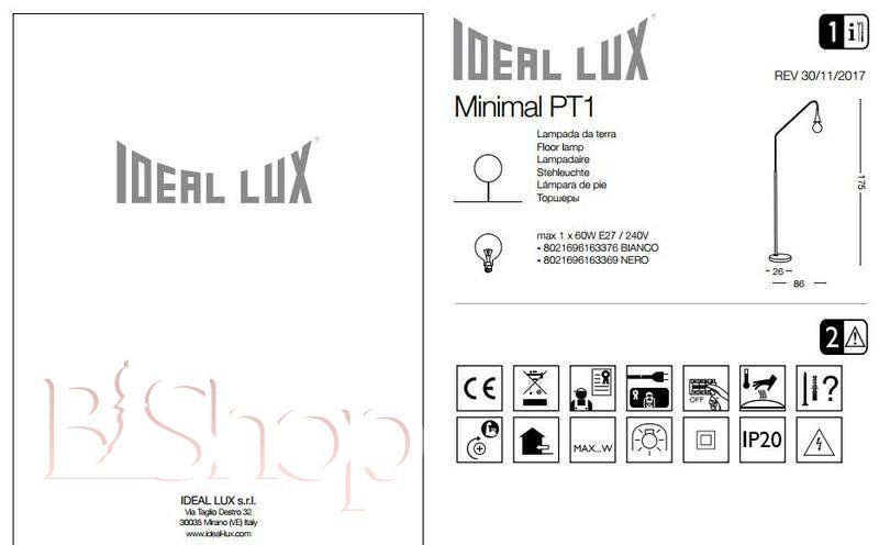 Кількість ламп: 1. Тип цоколя: E27. Висота (див): 175. Ширина (див): 26. Потужність лампи (Вт): 60. Довжина (див): 86.