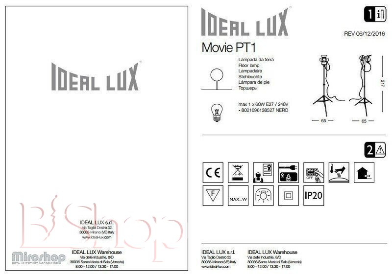 Кількість ламп: 1. Тип цоколя: E27. Висота (див): 217. Потужність лампи (Вт): 60. Діаметр (див): 65.