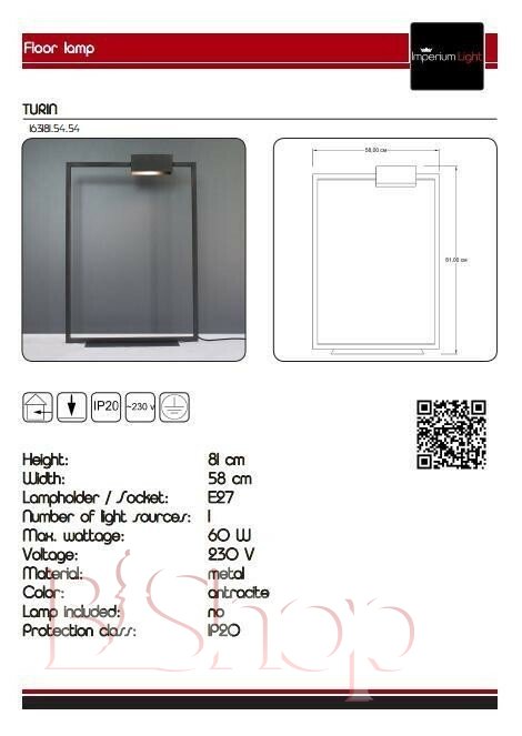 Кількість ламп: 1. Тип цоколя: E27. Висота (див): 81. Ширина (див): 58. Потужність лампи (Вт): 60.