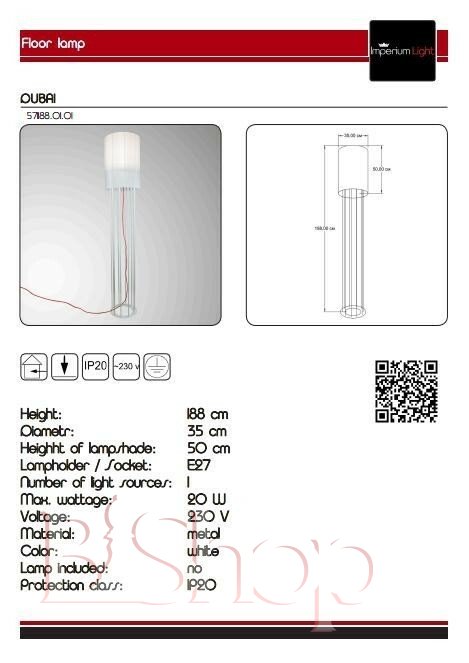 Кількість ламп: 1. Тип цоколя: E27. Висота (див): 188. Потужність лампи (Вт): 20. Діаметр (див): 35.
