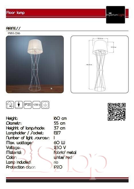 Кількість ламп: 1. Тип цоколя: E27. Висота (див): 160. Потужність лампи (Вт): 60. Діаметр (див): 55.