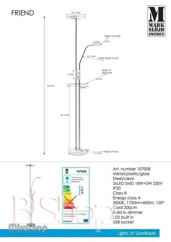 Кількість ламп: 2. Тип цоколя: LED. Висота (див): 180. Потужність лампи (Вт): 18. Діаметр (див): 25.5.