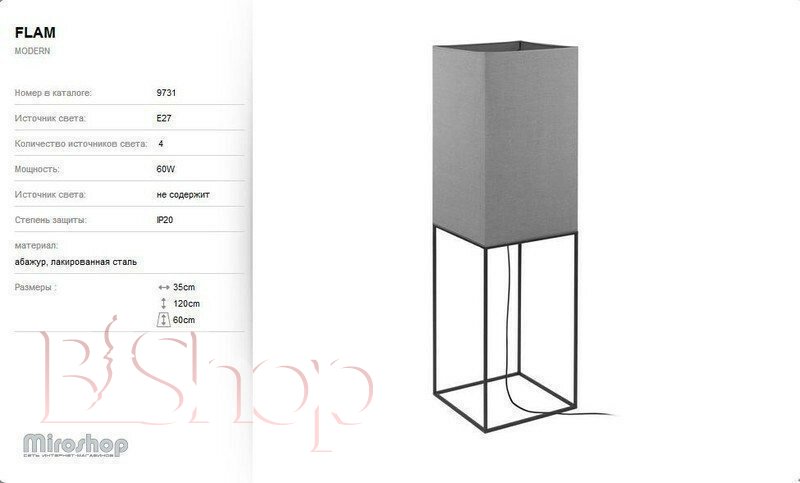 Кількість ламп: 4. Тип цоколя: E27. Висота (див): 120. Ширина (див): 35. Потужність лампи (Вт): 60. Довжина (див): 35.