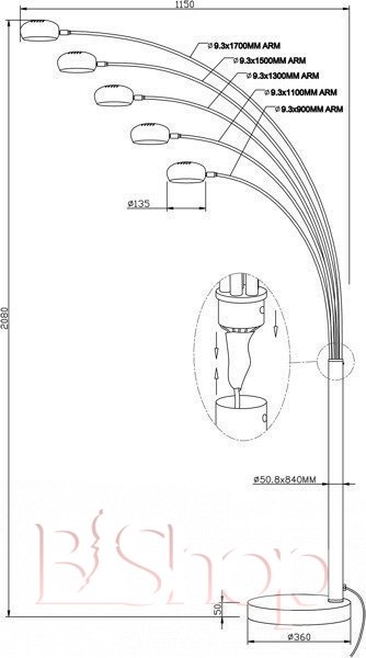 Кількість ламп: 5. Тип цоколя: E14. Висота (див): 208. Ширина (див): 36. Потужність лампи (Вт): 40. Довжина (див): 115.