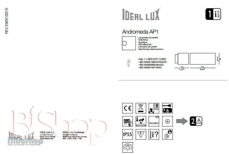 Кількість ламп: 1. Тип цоколя: E27. Висота (див): 9. Потужність лампи (Вт): 60. Довжина (див): 22.