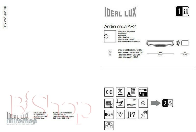 Кількість ламп: 2. Тип цоколя: E27. Висота (див): 8. Глибина (див): 9.5. Потужність лампи (Вт): 60. Довжина (див): 45.