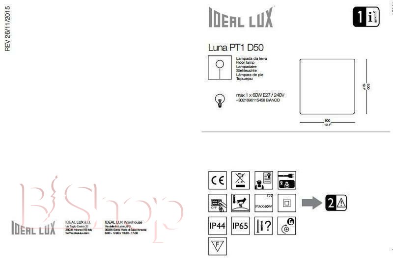 Кількість ламп: 1. Тип цоколя: E27. Висота (див): 50. Ширина (див): 50. Потужність лампи (Вт): 60. Довжина (див): 50.
