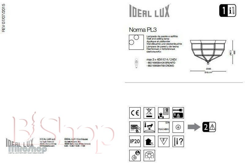 Кількість ламп: 3. Тип цоколя: E14. Висота (див): 20. Потужність лампи (Вт): 40. Діаметр (див): 26.